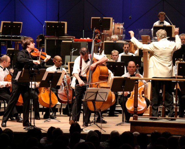 Joshua Bell and Edgar Meyer performing the world premiere of Meyer’s Double Concerto with the Boston Symphony Orchestra and conductor Michael Stern at Tanglewood, July 7, 2012.