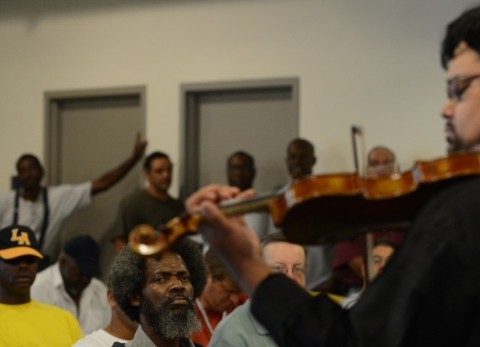 So, Vijay Gupta started gathering his colleagues in the LA Philharmonic and other LA-area musicians to go to Skid Row and perform. They played at several clinics and shelters, including the LA Department of Mental Health.