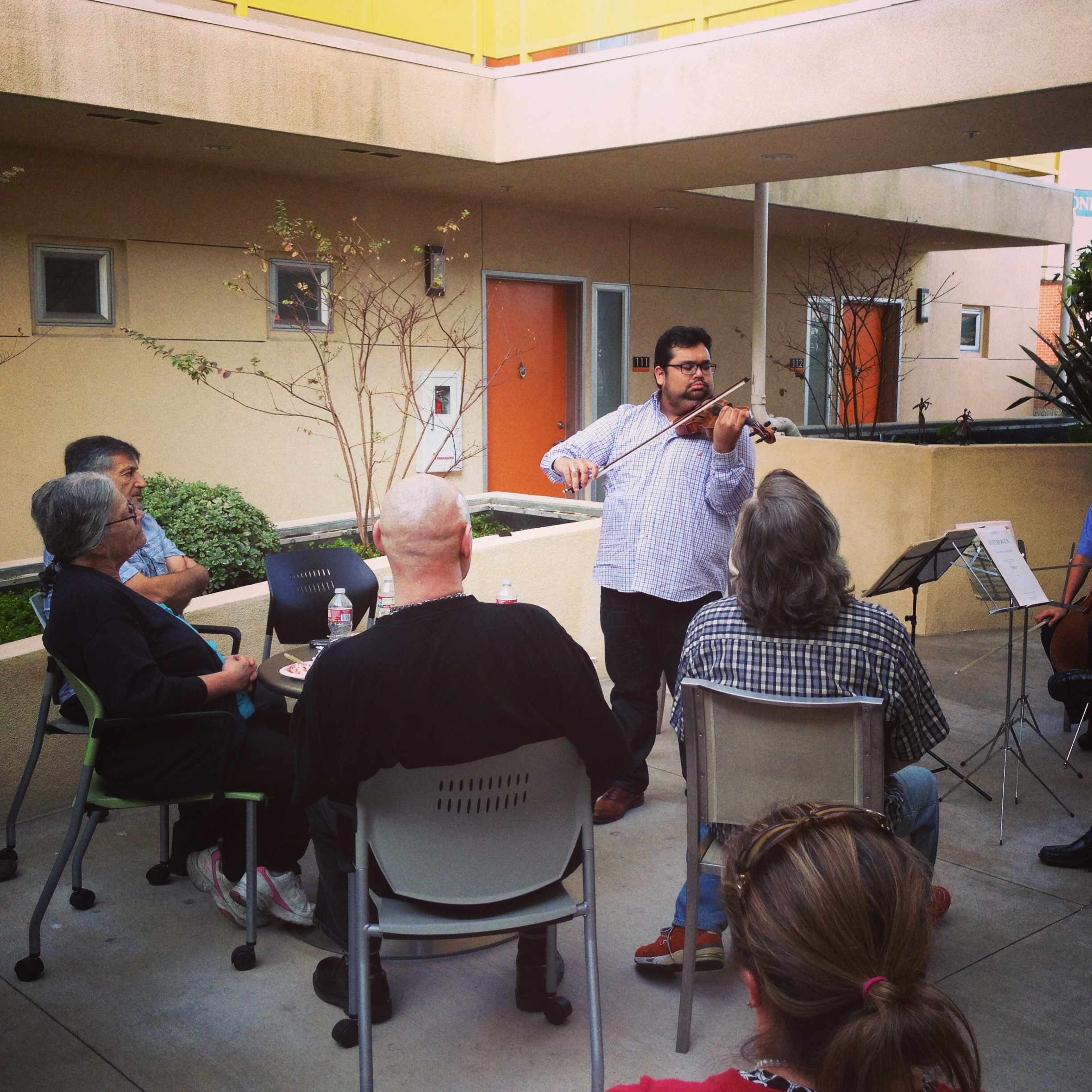 Recently, Gupta and his colleagues with Street Symphony have focused their performing energies in a couple of places: performances in jails, and a partnership with PATH—People Assisting the Homeless. Not long ago, I attended a Street Symphony performance at a permanent supportive housing PATH facility for formerly homeless residents of Silver Lake.
