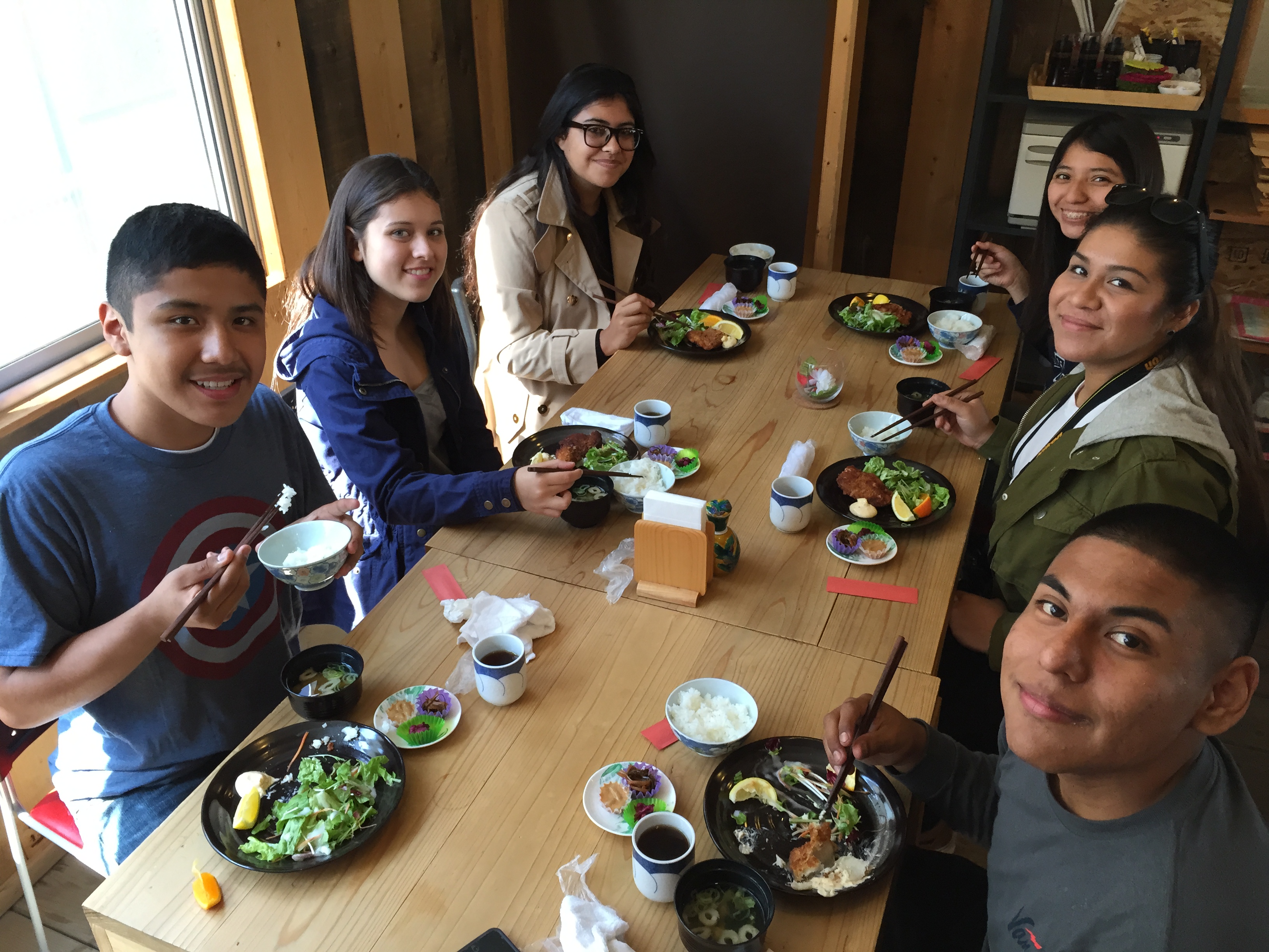 Local food and tap water, we have been assured, is completely safe to eat and drink; so local fish, salad, miso soup, and green tea it was for lunch. And it was delicious! (Though not everyone was a fan of the raw squid in liver sauce, pickled seaweed, and pickled Japanese cucumber that served as appetizers.)